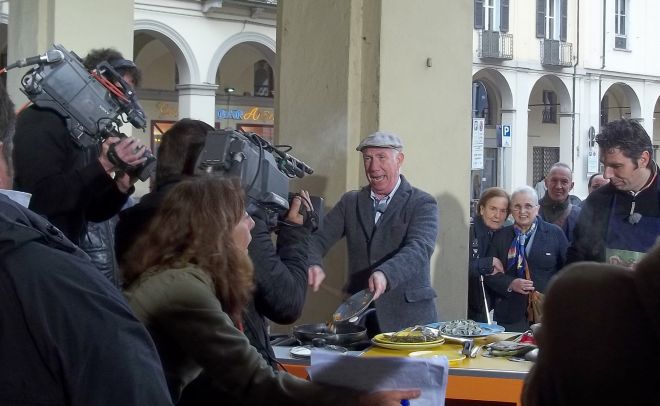 La Troupe del programma televisivo “Ricette di Famiglia” ha fatto tappa a Tortona dopo essere stata ad Acqui terme e Casale Monferrato. Una giornata intera di riprese, quella di mercoledì, con diversi curiosi che hanno sfidato la pioggia per vedere cosa stava succedendo.