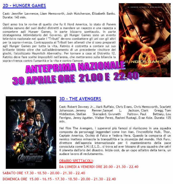 The Avengers, il film del week end, di cui domani vi proporremo un ampio servizio, ma che vale veramente la pena di vedere. Questo è sicuramente il film della settimana, ma vi anticipiamo subito che da lunedì la Multisala Megaplex Stardust proporrà un’altra anteprima italiana che vi suggeriamo di non perdere: Hunger games.