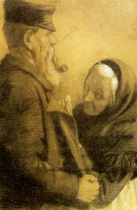 Il disegno, firmato e datato 1907, è stato realizzato su carta con gessetto bianco e carboncino (misure mm 860 x 720) e raffigura un uomo anziano, con pipa e cappello, in attesa che l’anziana donna intenta a cucirgli un bottone finisca il suo lavoro. Proprio la particolarità del soggetto e la bellezza dell’opera ha portato la Regione Lombardia a richiederla per la mostra La vita condivisa. I gesti della famiglia nelle immagini dell’arte che si terrà nella Galleria del Credito Valtellinese del Palazzo delle Stelline di Milano, dal 15 maggio al 1° luglio 2012.