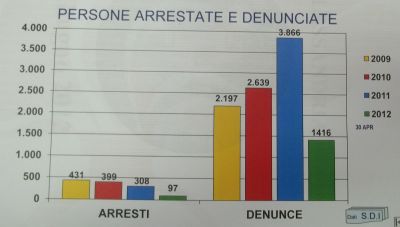 Numeri incredibili per quella che è una pressante attività di controllo sul territorio che sta dando ottimi frutti e che potrebbero essere destinati ad aumentare perché solo nei primi 4 mesi del 2012 le persone arrestate e denunciate, in provincia, sono già 1.513.