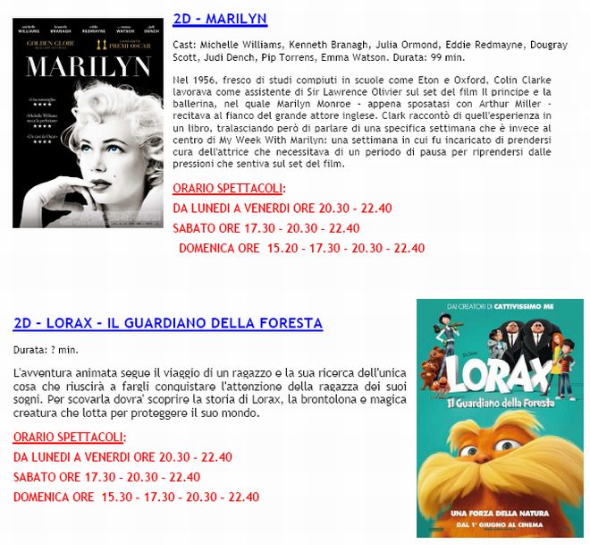 Uno dei più gettonati é sicuramente “Marilyn” con una grande interpretazione di Michelle Williams, ma adatto a tutti é sicuramente “Lorax – Il guardiano della foresta” un cartone animato 3D veramente spettacolare per chi ama gli effetti speciali, mentre da vedere sono anche “Viaggio in paradiso” e “Killer Elite” . Gli appassionati di fantascienza possono vedere “Invasione aliena” molto gettonato dalla critica, mentre chi non li ha ancora visti non può perdersi “Men in Black 3″ e Black Shadow”. Di questi ultimi due trovate la recensione cliccando su “Cinema” nella sezione Tag.