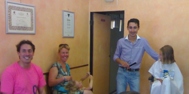 Roberto, tuo figlio, sta facendo i capelli ad una famiglia che viene dal Nord Europa. Fiore International Barber Shop?