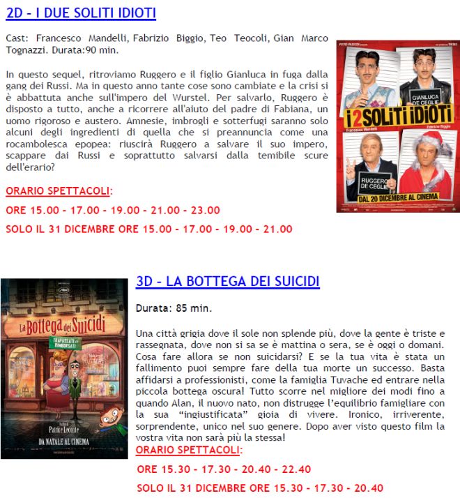 Oltre ai film di Natale, questa settimana c’é la news entry “la Bottega dei suicidi” un nuovo cartone animato che porta a 4 i film per bambini in queste feste natalizie. Film di cartoni animati tutto molto belli e godibili, alcuni dei quali come “Ralph Spaccatutto” della Disney, adatti anche agli adulti.