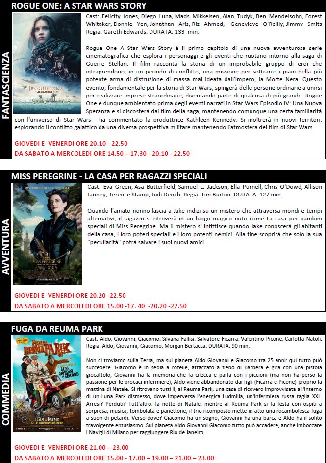 Natale al cinema è un classico, ma stavolta oltre ai cosiddetti “cinepanettoni” cioé i film comici tipici di questo periodo, ai cartoni animati natalizi per i bambini e alle “favole” come “Miss Peregrine – La casa per ragazzi speciali” ce ne sono alcuni che meritano di essere visti: primo su tutti “Rogue one” film spin-off della saga di Star Wars decisamente superiore all’ultimo della serie, quel settino episodio che tanti ricorda il primo uscito 40 anni fa. L’attrice feliciti Jones è sicuramente valida e interpreta un personaggio credibile. peccato non averla scelta per continuare la serie originale. Inoltre si rivedono astronavi e personaggi e personaggi della prima serie fra cui Dart Fener, che qui viene chiamato – purtroppo – col suo nome inglese di Lord Vader, unica nota stonata di un film che seppur non alteza di quelli prodotti da Lucas è sicuramente superiore al primo prodotto dalla Walt Diseny sugli schermi lo scorso Natale.