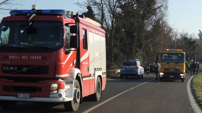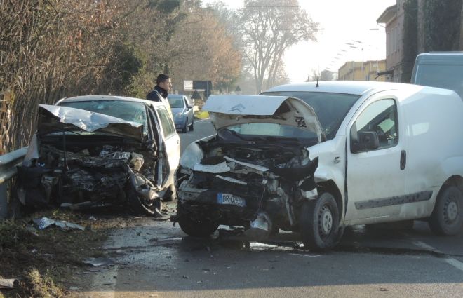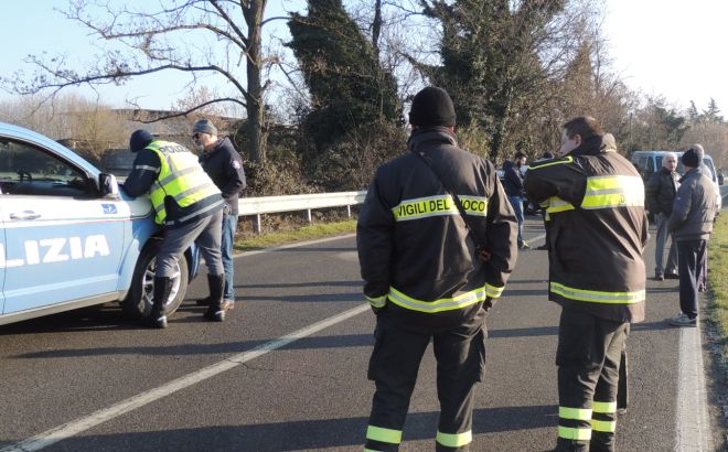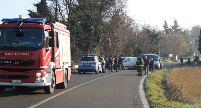 L’auto distrutta dal’impatto devastante in cui stava seduto il pensionato Adriano Piccinini deceduto oggi all’età di 86 anni, i due mezzi coinvolti, i Vigili del fuoco, il traffico deviato e la polizia che effettua i rilievi.