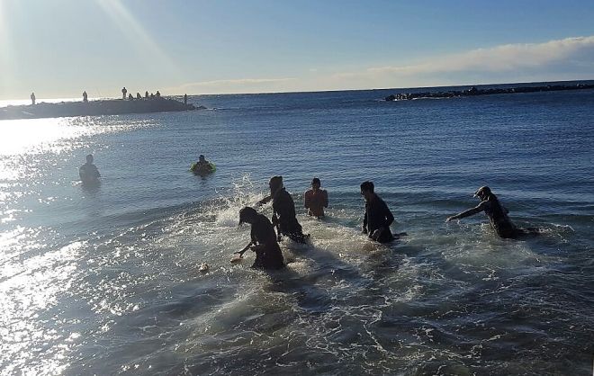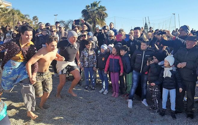 Una piccola folla ha atteso, incoraggiato e applaudito questa mattina le “Befane” di San Bartolomeo al Mare, che si sono tuffate in mare per festeggiare l’arrivo del nuovo anno e quello della simpatica vecchina. Su impulso del CIV “Le vie del Cuore” una decina di goliardi si sono dati appuntamento e, vestiti di tutto punto, hanno saggiato la loro resistenza alle temperature di stagione. Una splendida giornata di sole ha reso l’impatto meno traumatico del previsto. Gli eventi per festeggiare la Befana proseguono con la 24ma edizione del Trofeo Indoor dell’Epifania di Tiro con l’Arco e – nel pomeriggio di venerdì (ore 15.00, Piazza Torre Santa Maria) – con lo spettacolo di magia e comicità“Illudetevi pure” del cabarettista e prestigiatore Giovanni Giannini. La giornata dell’Epifania si concluderà alle 17 con il Falò della Befana (a cura del CIV “Le vie del Cuore”).