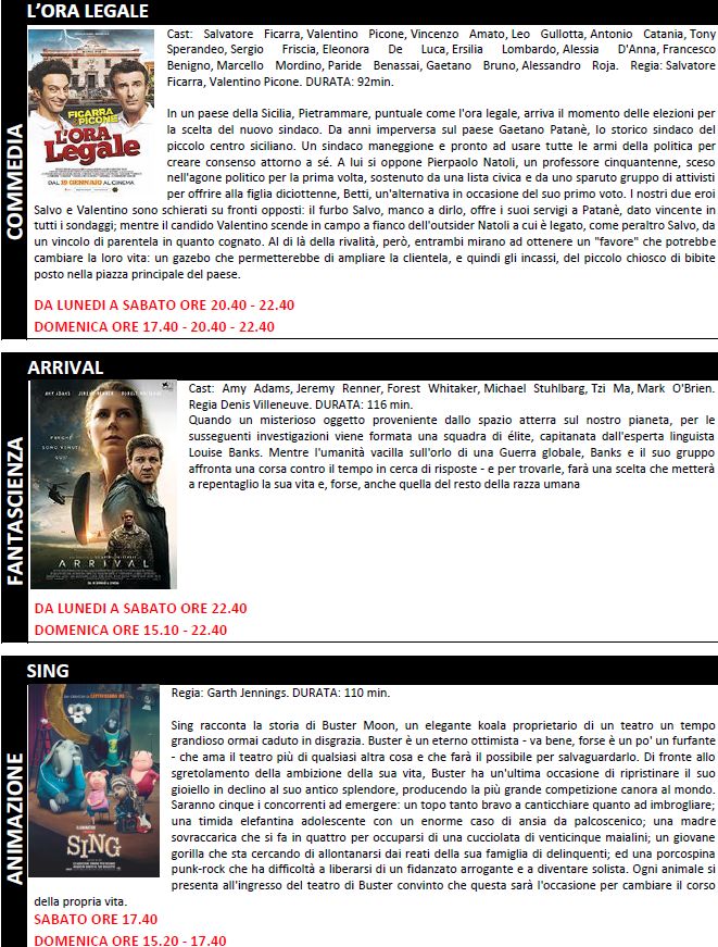 Chi scrive (almeno per ora) è riuscito a vedere solo Arrival, ottimo film di fantascienza, tutt’altro che banale con un finale incredibile.