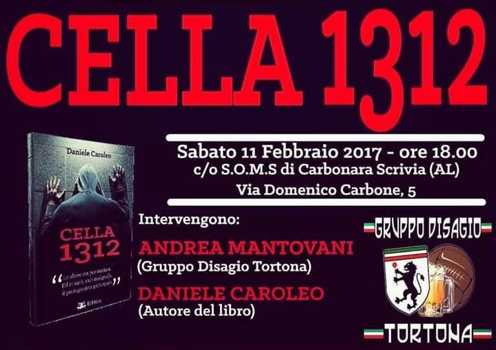 Sabato 11 febbraio, alle ore 18, il “Gruppo Disagio Tortona”, presso la S.O.M.S. di Carbonara Scrivia (Al), presenterà il libro “Cella 1312”, romanzo scritto da Daniele Caroleo, giornalista e fotoreporter di riviste Ultras. Il libro, ambientato in una cella di massima sicurezza, racconta di come, in un futuro non poi lontanissimo, bisognerà fare i conti con la repressione indiscriminata da parte dei governanti. Il terrorismo psicologico, la manipolazione dell’informazione e i microchip sottocutanei sono alcuni dei motivi che hanno indotto il protagonista a ribellarsi a questo sistema dittatoriale, portandolo così all’arresto.