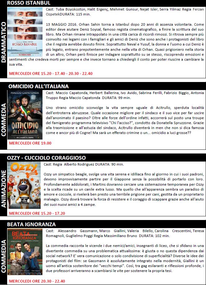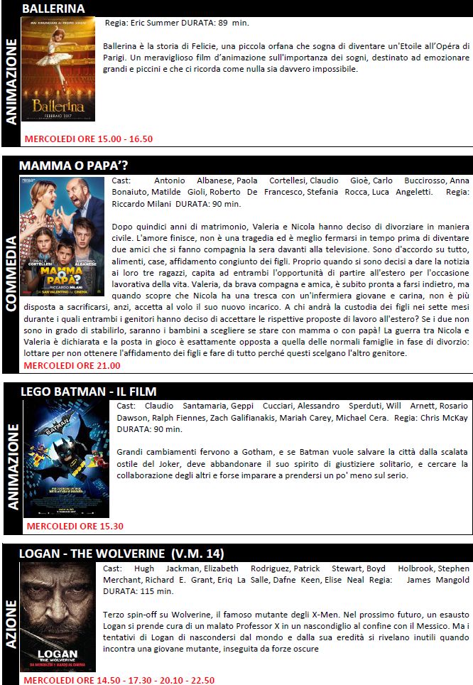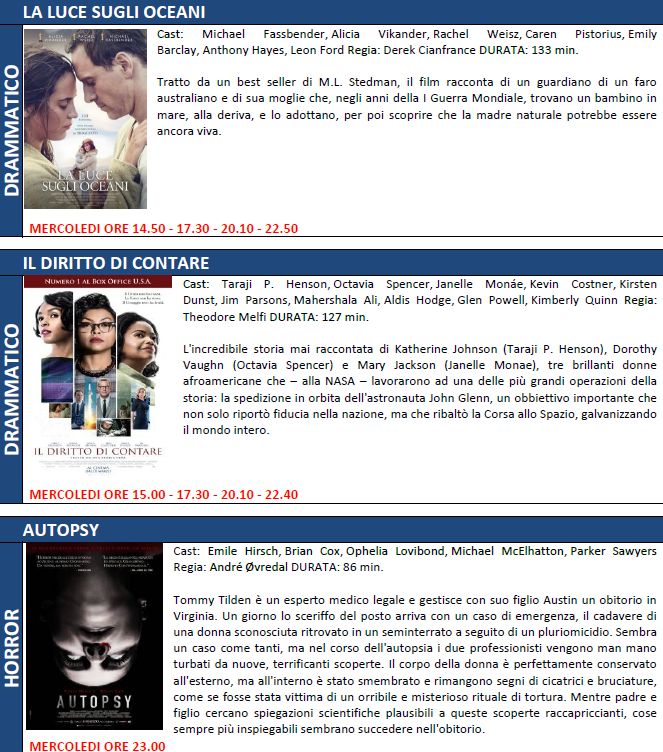 A questi si aggiungono ovviamente tutti gli altri già in programmazione, fra cui Logan, Jackie, Beta Ignoranza, mamma o papà e molti altri per un totale di ben 14 film e 33 spettacoli.