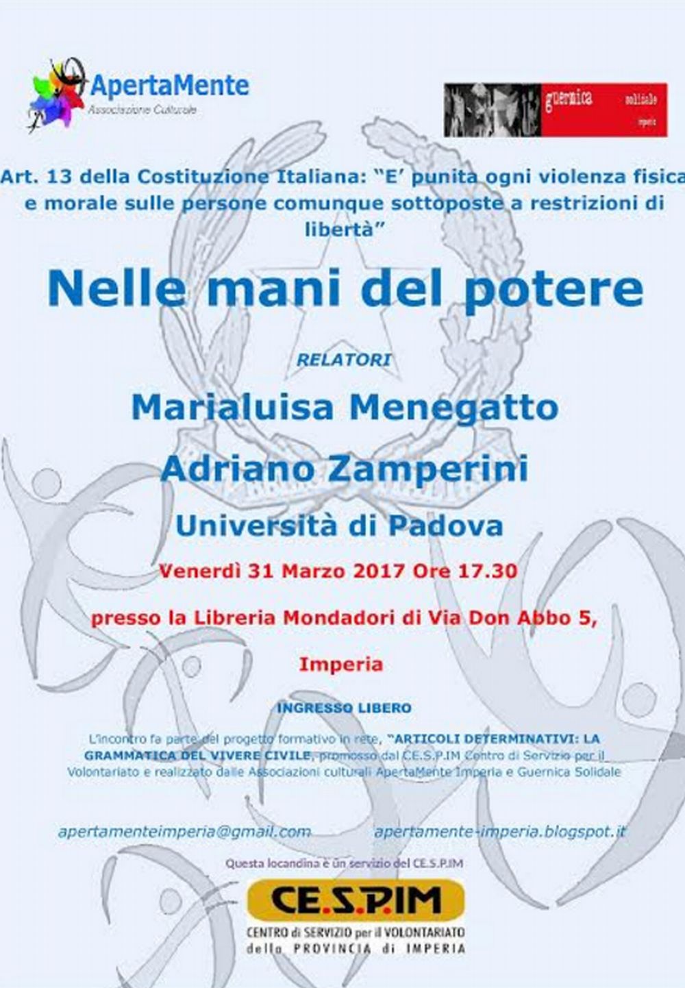 L’associazione culturale ApertaMente Imperia e l’associazione Guernica solidale con il supporto del CE.S.P.IM, nel piano delle attività programmate per l’anno 2017 , organizzano il venerdì 31 marzo 2017 presso la Libreria Mondadori di Via Don Abbo 5, Imperia alle ore 17.30 l’incontro dal titolo “Nelle mani del potere “