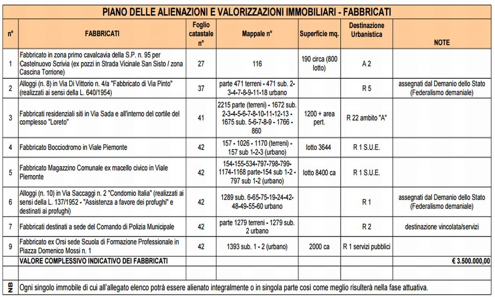 Il Comune di Tortona ha reso noto il Piano delle alienazioni e valorizzazioni immobiliari per un valore complessivo di 3 milioni e mezzo di euro che pubblichiamo di seguito: