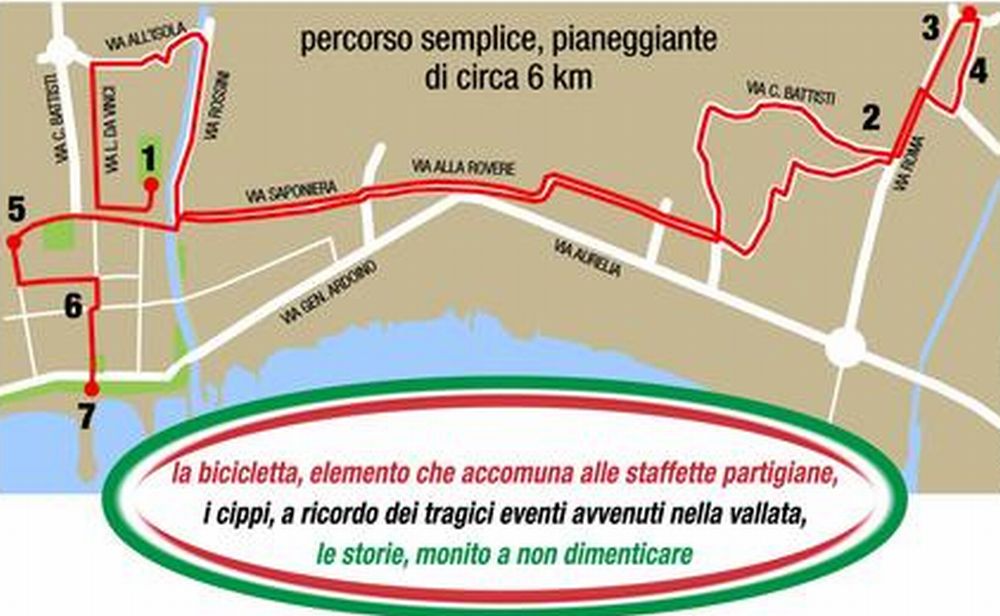 Si tratta di una cicloturistica di circa 6 km nel Golfo Dianese e sono previste brevi soste per ricordare alcuni fatti della lotta di Liberazione.