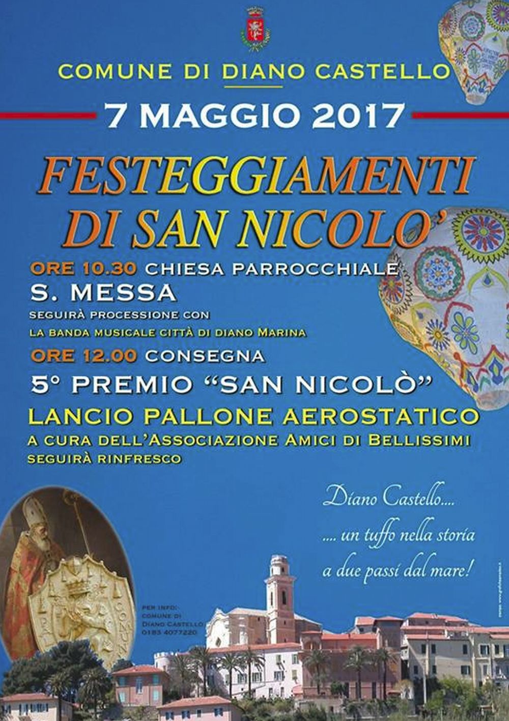 Domenica 7 maggio sarà festa a Diano Castello: alle ore 10.30 ci sarà la S. Messa per il santo patrono del paese con successiva premiazione da parte del Comune DI Diano Castello per il premio San Nicolò che andrà all’associazione “Amici del Castello” presieduta da Walter Mignone