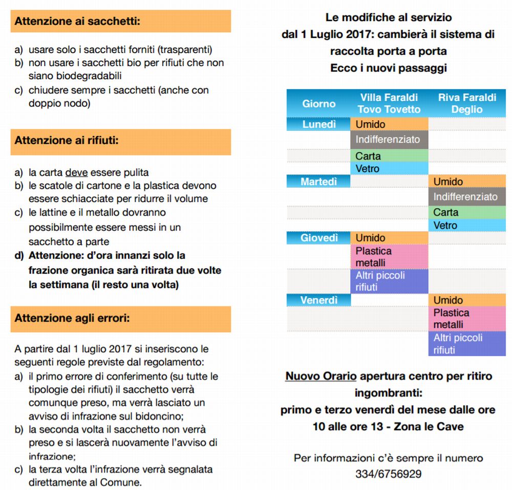 Pubblichiamo le modifiche del sistema di raccolta dei rifiuti operative dal 1 luglio 2017 nel Comune di Villa Faraldi. I depliant sono stati consegnati ad ogni utente