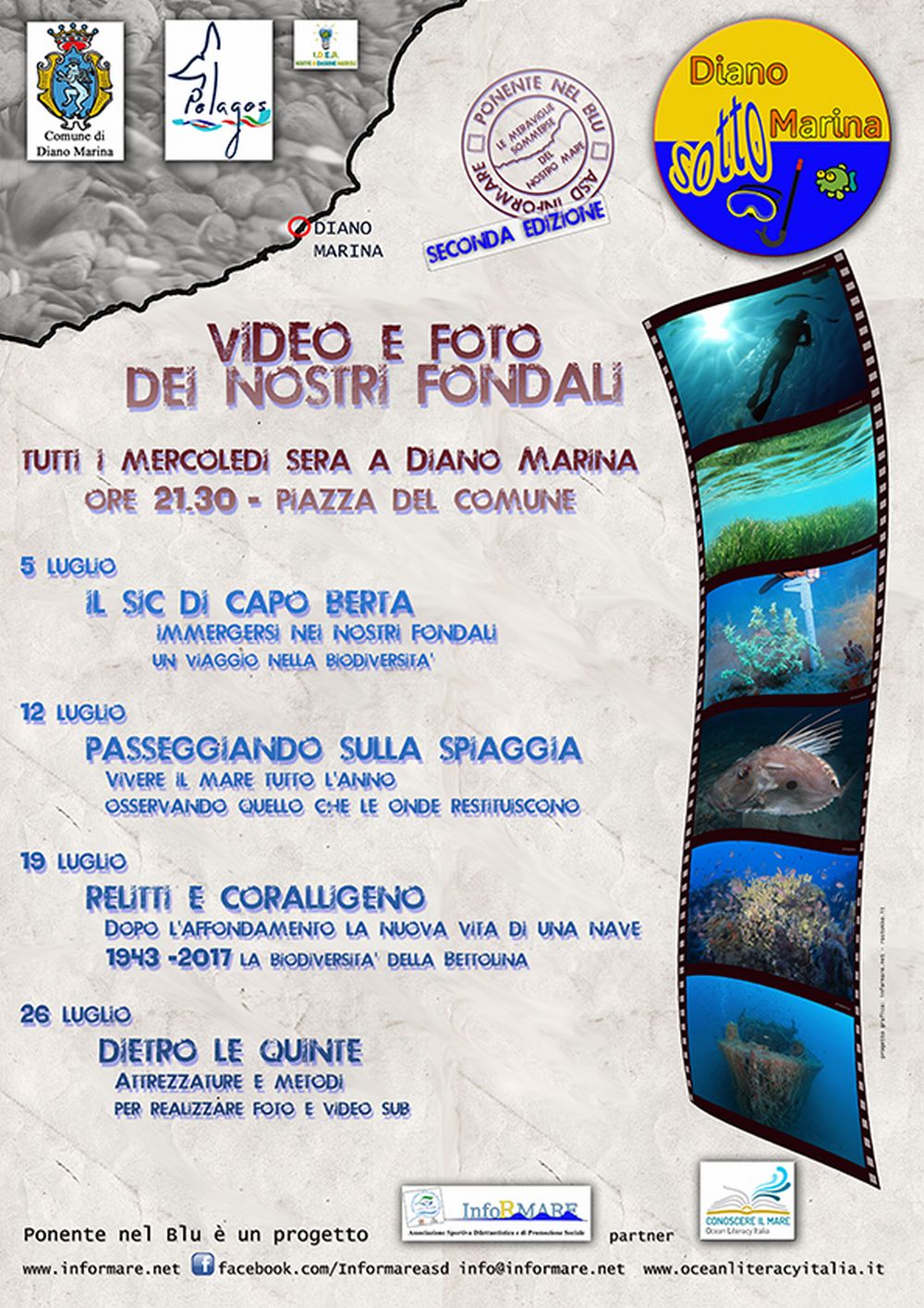 “La tutela, la protezione e la valorizzazione del territorio marino – sostengono i biologi e gli istruttori della Asd InfoRmare – partono dalla conoscenza”. Diano SottoMarina fà parte di un progetto più ampio, Ponente nel Blu, per il quale sono coinvolti anche altri Comuni delle province di Imperia e Savona. Informare è una benemerita associazione sportiva dilettantistica e di promozione sociale i cui principali referenti sono Gianmichele Falletto (presidente), Susanna Manuele (vice), Fabio Rossetto (resp. attività in mare) e Monica Previati (responsabile formazione).