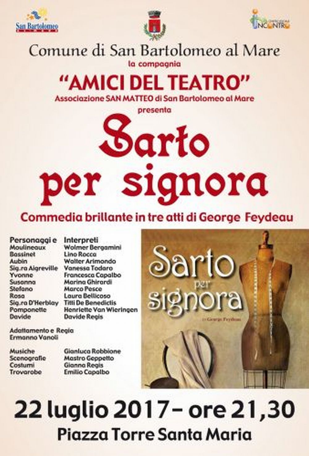 Nuovo appuntamento culturale a San Bartolomeo al Mare sabato 22 Luglio 2017: alle ore 21.30 in piazza Torre di Santa Maria va in scena “Sarto Per Signora” Commedia brillante in tre atti a cura della Compagnia teatrale San Matteo.