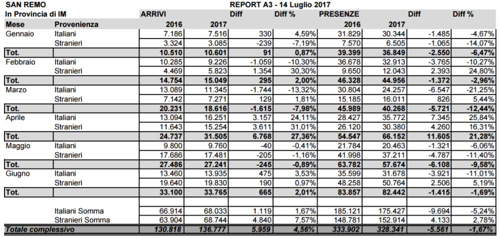 A fine articolo pubblichiamo la tabella coi dati dettagliati sul flusso turistico a Sanremo, di seguito invece la classifica dell’incremento dei flussi turistici negli altri comuni della Liguria a fine giugno.