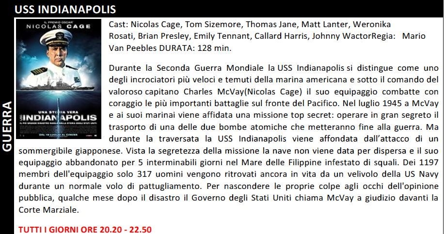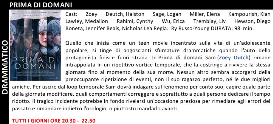 Di seguito pubblichiamo trame ed orari dei film in programmazione, dove a nostro avviso il film decisamente migliore è sicuramente “Prima di Domani” bella trama e magistralmente interpretato dalla giovane attrice Zoey Deutch di 22 anni figli dell’attrice Lea Thompson alla quale assomiglia in modo straordinario e dal regista Howard Deutch.