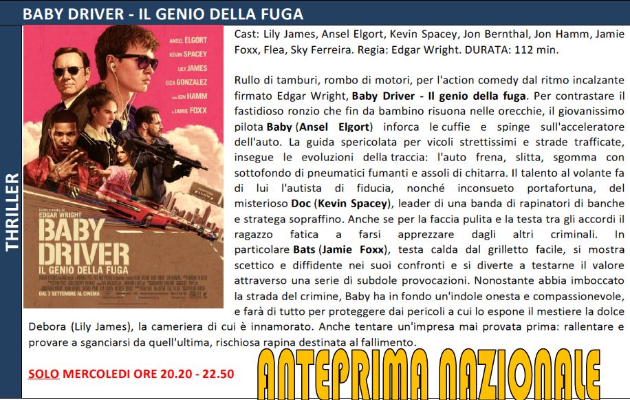 In attesa dei film di alto livello che inizieranno ad arrivare sugli schermi dopo il 15 agosto mercoledì 9 agosto alla Multisala Megaplex Stardust di Tortona è in programma un doppio spettacolo in anteprima nazionale che si può vedere soltanto stasera alle 20,20 e alle 22,50: il film “Baby Driver – Il genio della Fuga”