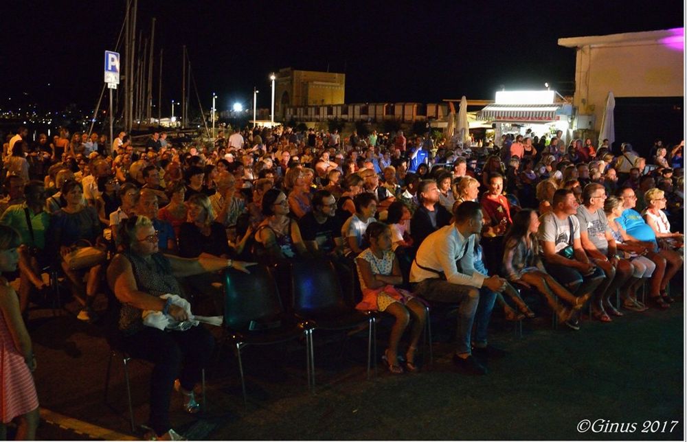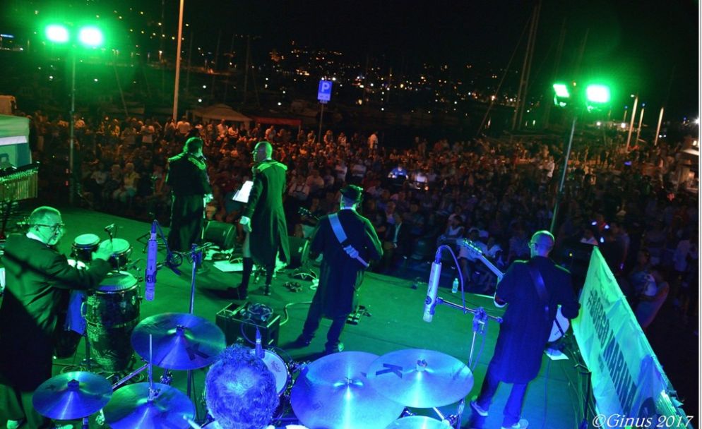 Tutte occupate le diverse centinaia di sedie predisposte dal Civ di Borgo Marina davanti al palco eretto presso la banchina Medaglie d’Oro e pubblico assiepato sui muretti e nei dehors dei bar per assistere allo spettacolo offerto dai 12 musicisti che compongono la formazione dei Fulminati nonché per ridere alle battute dei due front man del gruppo.