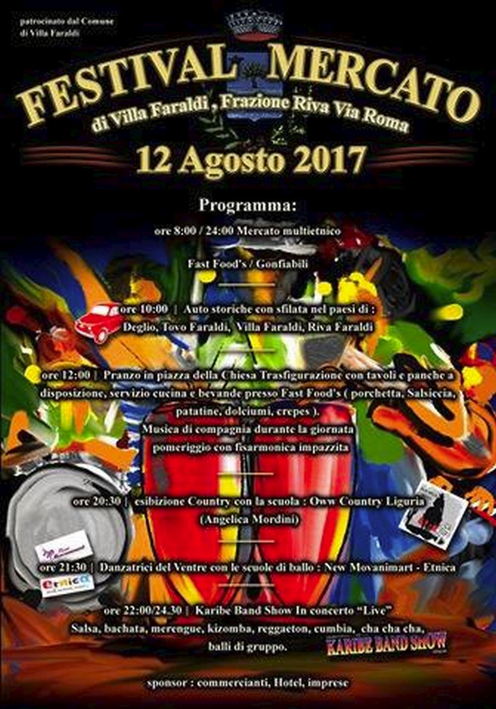 A partire dalle 8 mercato multietnico fast food e gonfiabili; seguono auto storiche con sfilata in tute le frazioni, prodotti tipici, colazioni e altro.