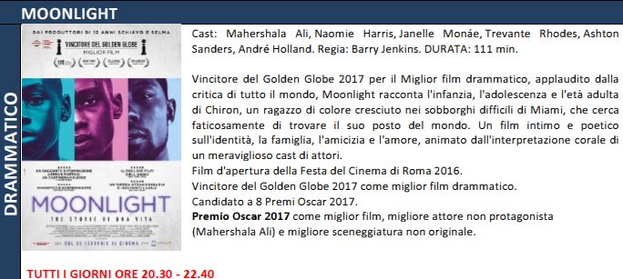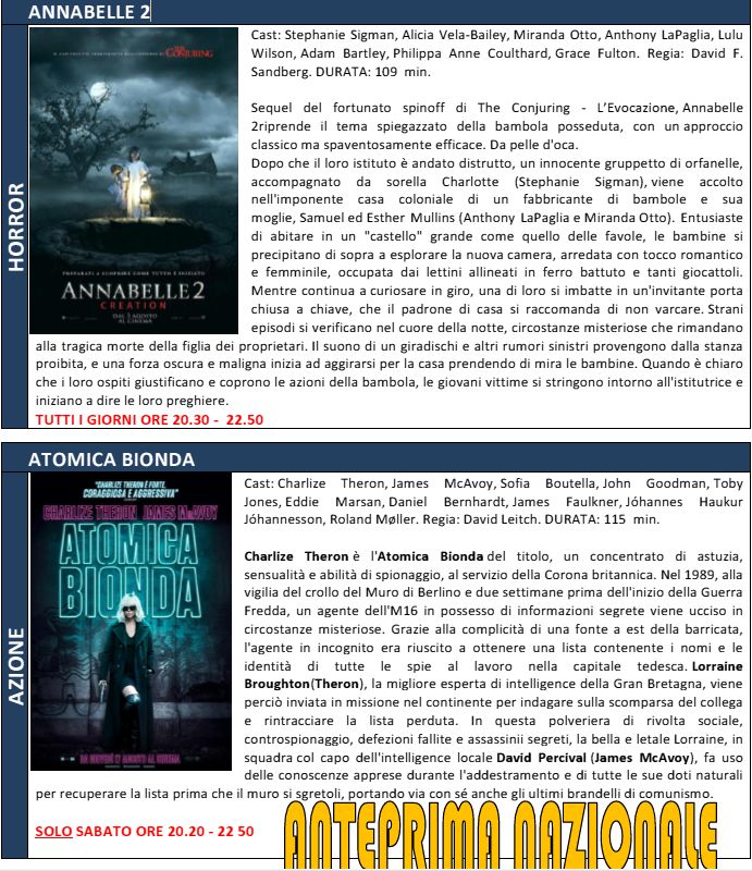 Atomica Bionda in anteprima nazionale ma anche Annabelle 2 e Moonlight, oscar 2017 come miglior film che nei mesi scorsi non era stato programmato in visione.
