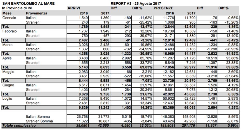 I dati ufficiali dell’Osservatorio regionale del turismo ligure parlano chiaro e sono inconfutabili: se Diano Marina è la seconda località balneare della Liguria, San Bartolomeo al mare è quella che seppur di poco, rispetto alla stessa Diano marina, è quella che nell’ultimo anno, in percentuale, ha registrato il maggior incremento di turisti nella riviera di Ponente: +5,99% rispetto al 2016.