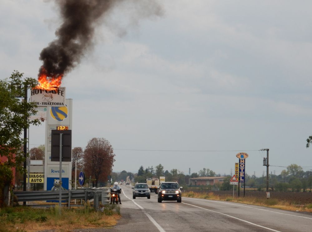Aveva appena smesso di piovere, ma l’insegna, come potete vedere, bruciava bene: l’erba era più che bagnata quindi non c’era pericolo che l’incendio si propagasse, l’insegna non sporgeva sull’ex statale ed essendo ben visibile non comprometteva l’incolumità pubblica, infine dove colava la plastica non c’era nulla.
