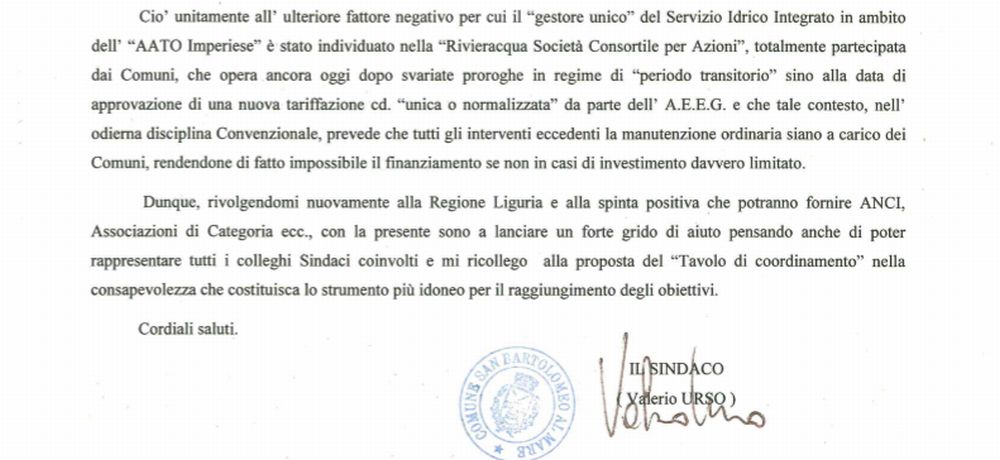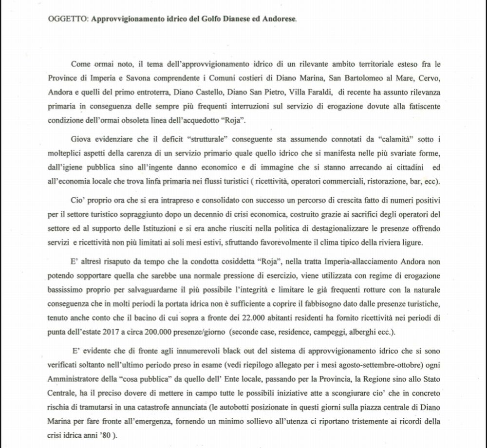 Urso tira fuori gli attributi e con una lettera di grande intensità (che pubblichiamo integralmente a fine articolo) inviata al presidente della Regione Liguria, a cinque assessori regionali, al responsabile regionale del Territorio, ai Prefetti e ai presidenti di Imperia e Savona, ai sindaci dei Comuni del Golfo più Andora, a Rivieracqia, Albergatori, Commercianti, Consumatori e Assoutenti, invita tutti a creare un un “Tavolo istituzionale per l’acquedotto calamità”.