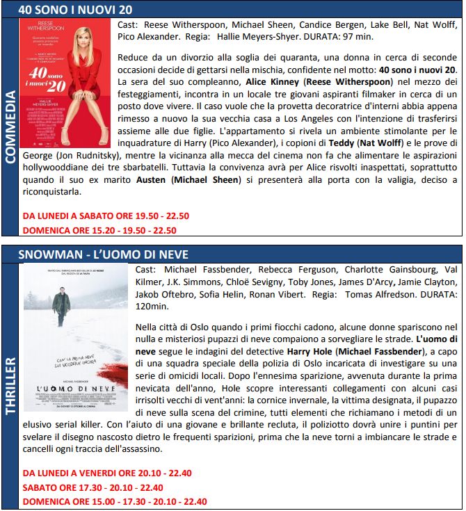 Tutte le trame e gli orari dei film del week end al Megaplex Stardust di Tortona 12 Ott, 2017 | Cinema | Ogni settimane almeno tre nuove primissime visioni: è questo che propone la multisala Megaplex Stardust di Tortona. Di seguito trame ed orari dei film della settimana, fra cui spicca l’ultimo di Michael Fassbender “L’uomo di neve”. Download QR 🠋 Correlati