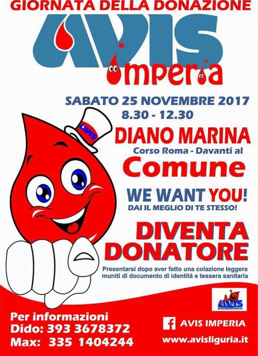 L’AVIS, in collaborazione con il Centro Trasfusionale, ha programmato per Sabato 25 novembre una giornata di donazione di sangue organizzando una raccolta a Diano Marina in Corso Roma (davanti al Comune) dalle ore 08.30 alle ore 12.30.