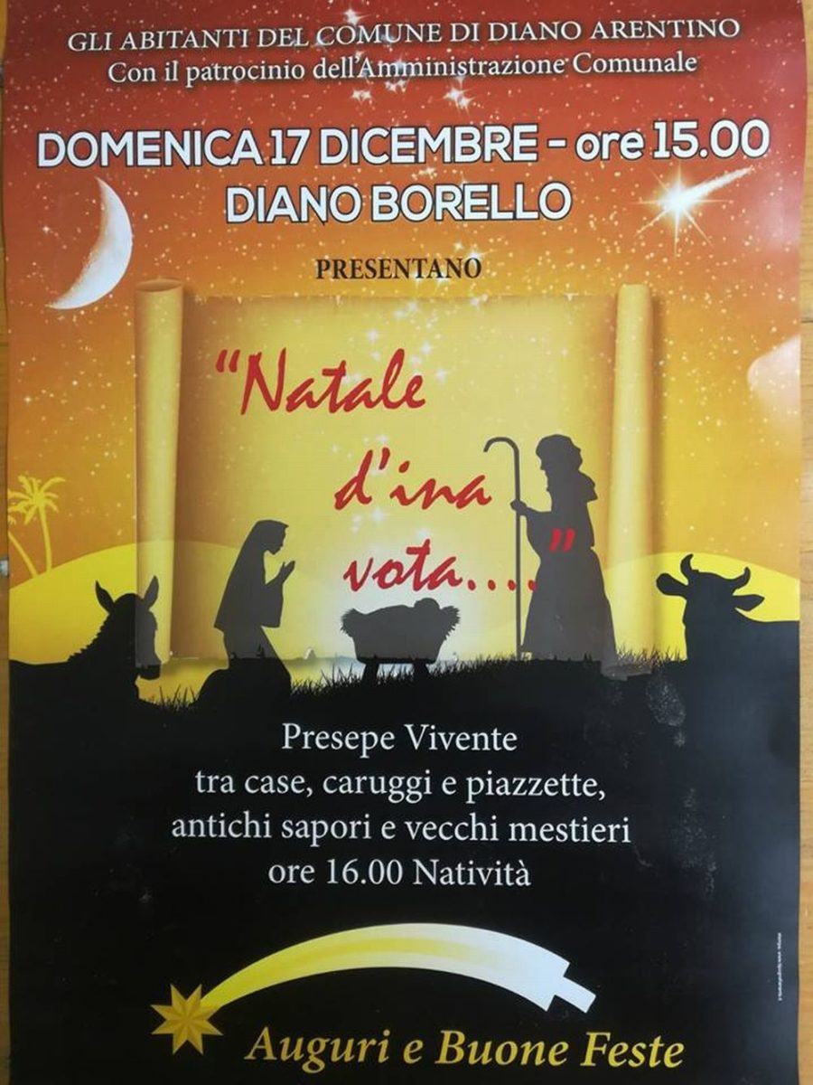 Domenica a Diano Arentino torna il presepe vivente con la rappresentazione della natività 16 Dic, 2017 | Golfo Dianese | Domenica 17 dicembre, a Diano Borello, frazione del Comune di Diano Arentino, gli abitanti mettono in scena il presepe vivente Download QR 🠋 Correlati