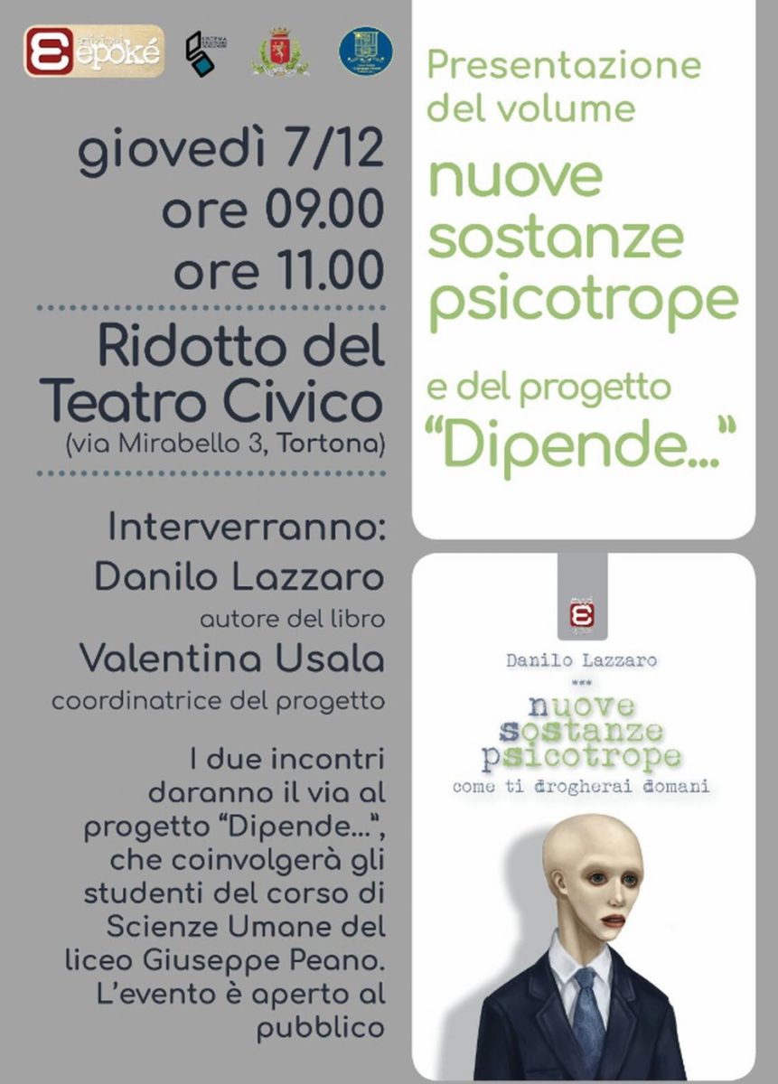 Giovedì 7 dicembre, il ridotto del Teatro Civico ospita un doppio appuntamento alle ore 9,00 e alle ore 11,00, dedicato al tema delle dipendenze, che vedrà la partecipazione di Danilo Lazzaro, autore del volume “Nuove sostanze psicotrope. Come ti drogherai domani” e Valentina Usala, coordinatrice del progetto “Dipende…” che coinvolgerà gli studenti del corso di Scienze Umane del Liceo Giuseppe Peano di Tortona.