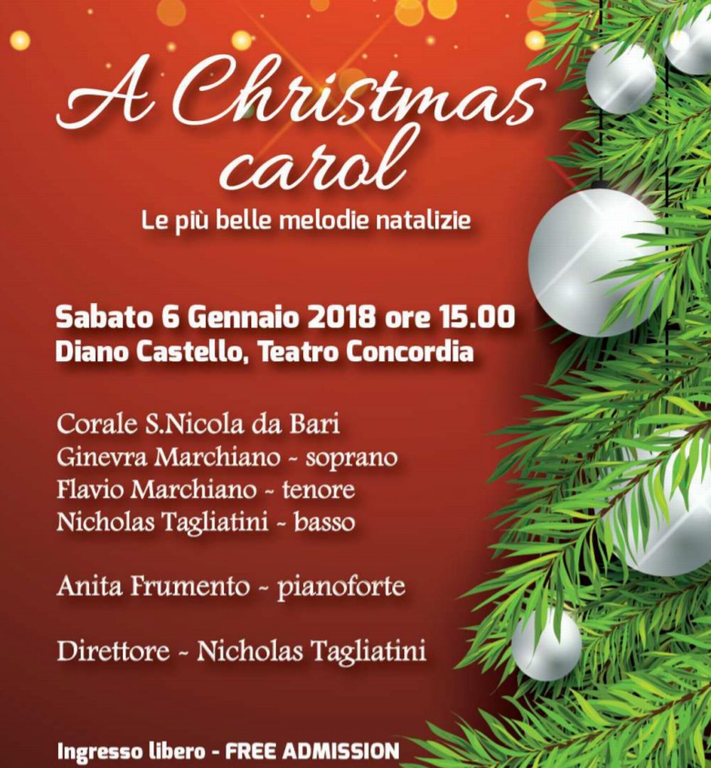 Diano Castello festeggia l’epifania e chiude le festività natalizie con un concerto gratuito diretto da uno dei suoi figli più illustri, Nicholas Tagliatini. Lo farà Sabato 6 Gennaio, alle ore 15.00 nella suggestiva cornice del Teatro Concordia, andrà in scena il concerto dal titolo “A Christmas carol – Le più belle melodie natalizie”.