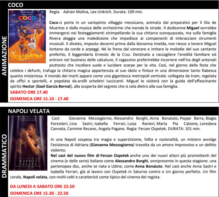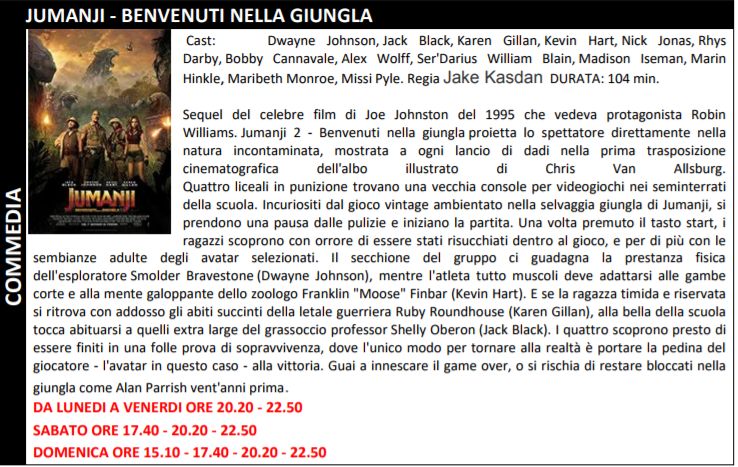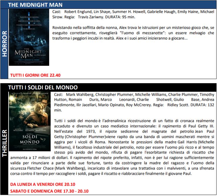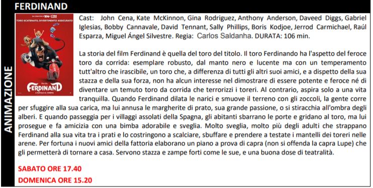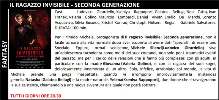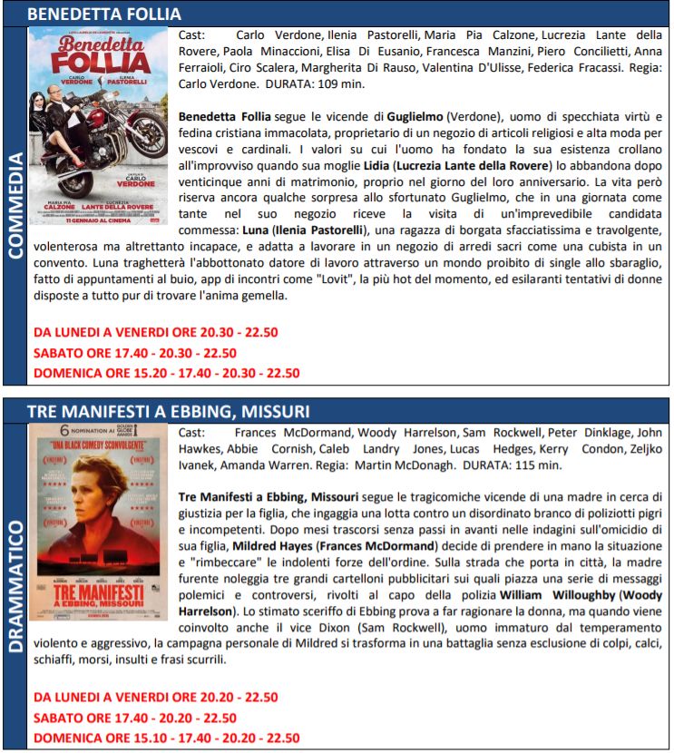 Tre film nuovi che si aggiungono a quelli in prima visione dalla scorsa settimana, portano a dieci il numero delle pellicole in programmazione. Tra i nuovi c’è “Tre manifesti a Ebbing, Missuri” vincitore di Golden Globe, mentre tra gli altri suggeriamo di non perdere “Il ragazzo invisibile – Seconda Generazione”.