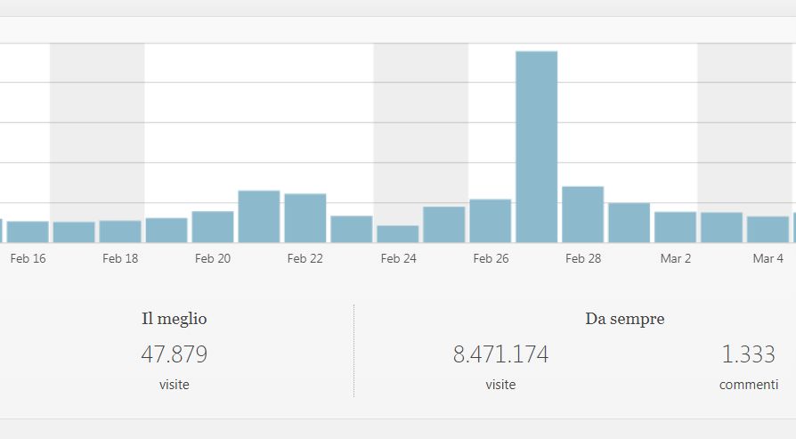 Il nostro ingegnere informatico ci ha comunicato che mercoledì 27 febbraio, Oggi Cronaca è stato visitato da ben 47.879 persone. Si tratta del nuovo record di visitatori che, come potete vedere dalle tabelle che pubblichiamo a fine articolo ha polverizzato il precedente record di 25.642 visitatori in un sol giorno che risaliva al 3 maggio 2015.