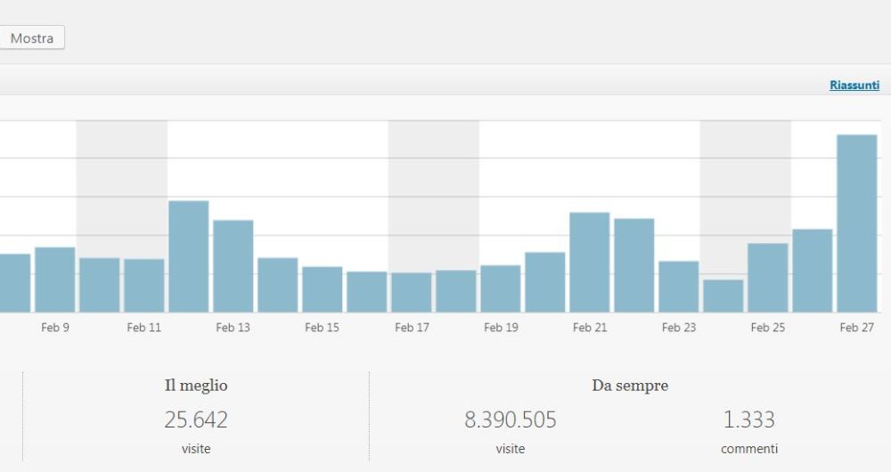 Di seguito due immagini dello screenshot del server: la prima alle 15 del pomeriggio del 27 febbraio, quando quando ancora si vedeva il vecchio record di 25.642 visite, ma si capiva che sarebbe stato battuto perché quel giorno a quell’ora le visite erano già oltre 23 mila e sotto l’immagine con il nuovo record.