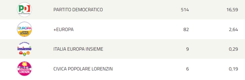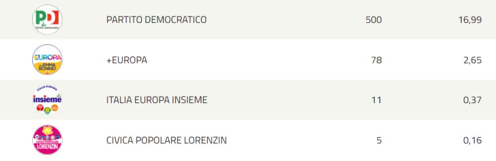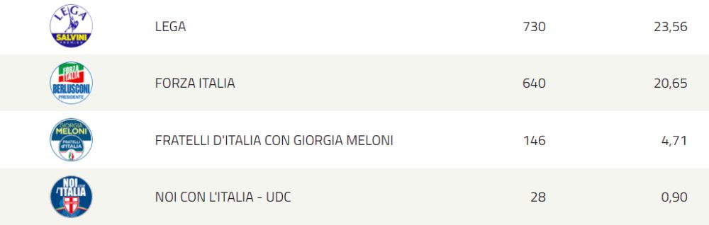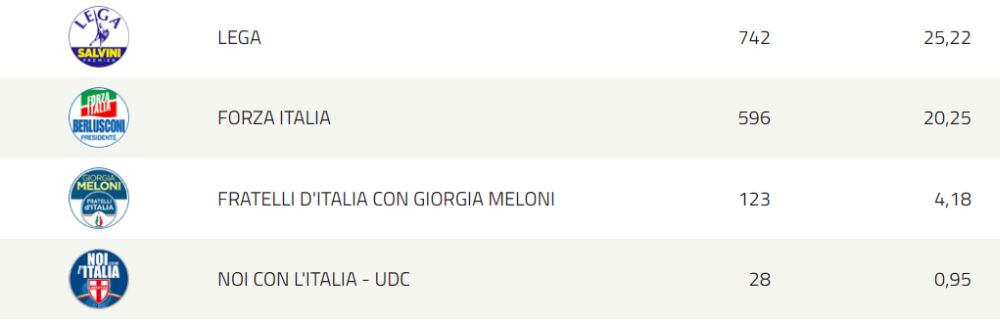Alla Camera la Lega Nord ha ottenuto il 23,56% dei voti (nel 2013 aveva il 4,07), il Movimento Cinquestelle il 23,98 (aveva il 33,58), Forza Italia il 20,65 (aveva il 26,64), il Partito Democratico il 16,59 (aveva il 17,32) e Fratelli d’Italia il 4,71 (aveva il 2,1).