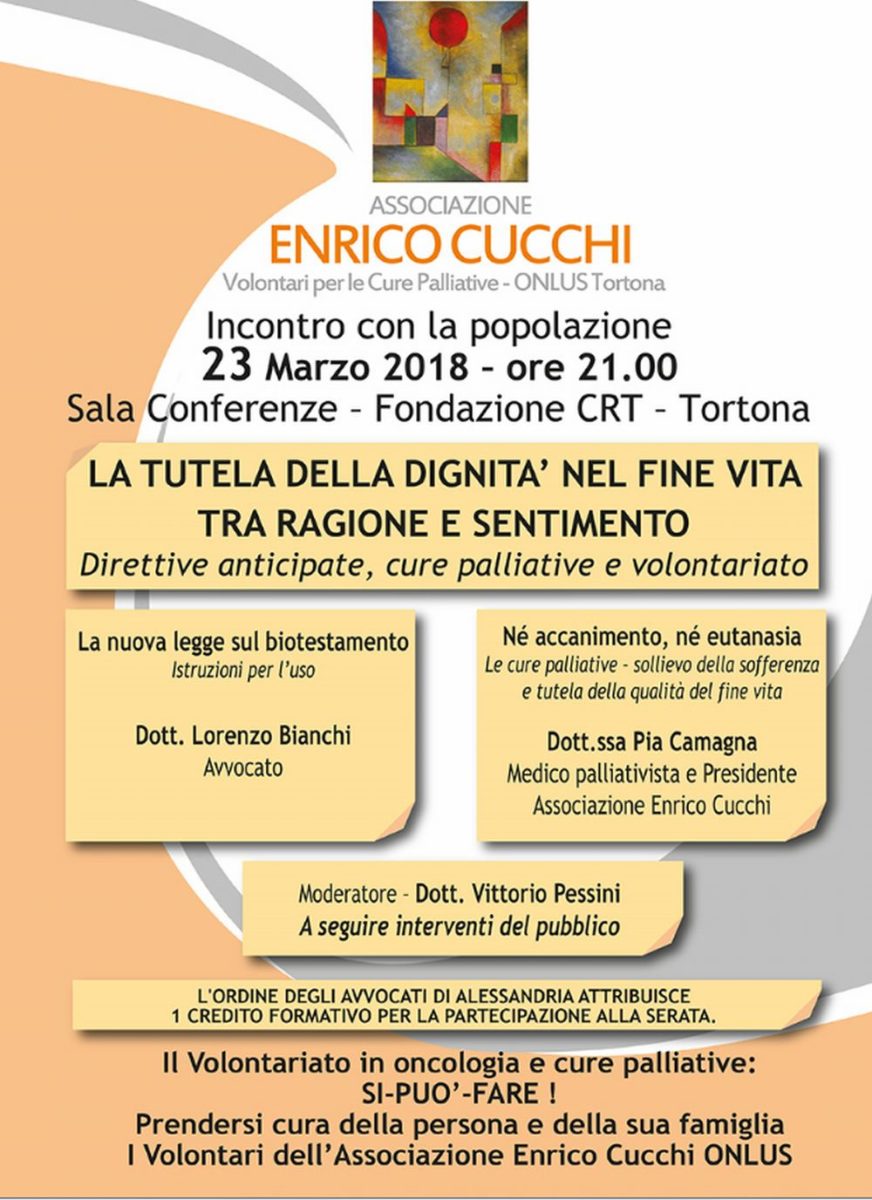 Lunedì 23 marzo alle ore 21 presso la Sala Conferenze della Fondazione Cassa di Risparmio di Tortona si terrà un convegno dal titolo “La tutela della dignità nel fine vita tra ragione e sentimento”. Interverranno l’avvocato Lorenzo Bianchi e la dott.ssa Pia Camagna.