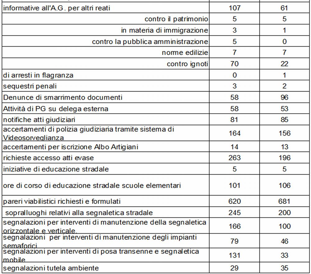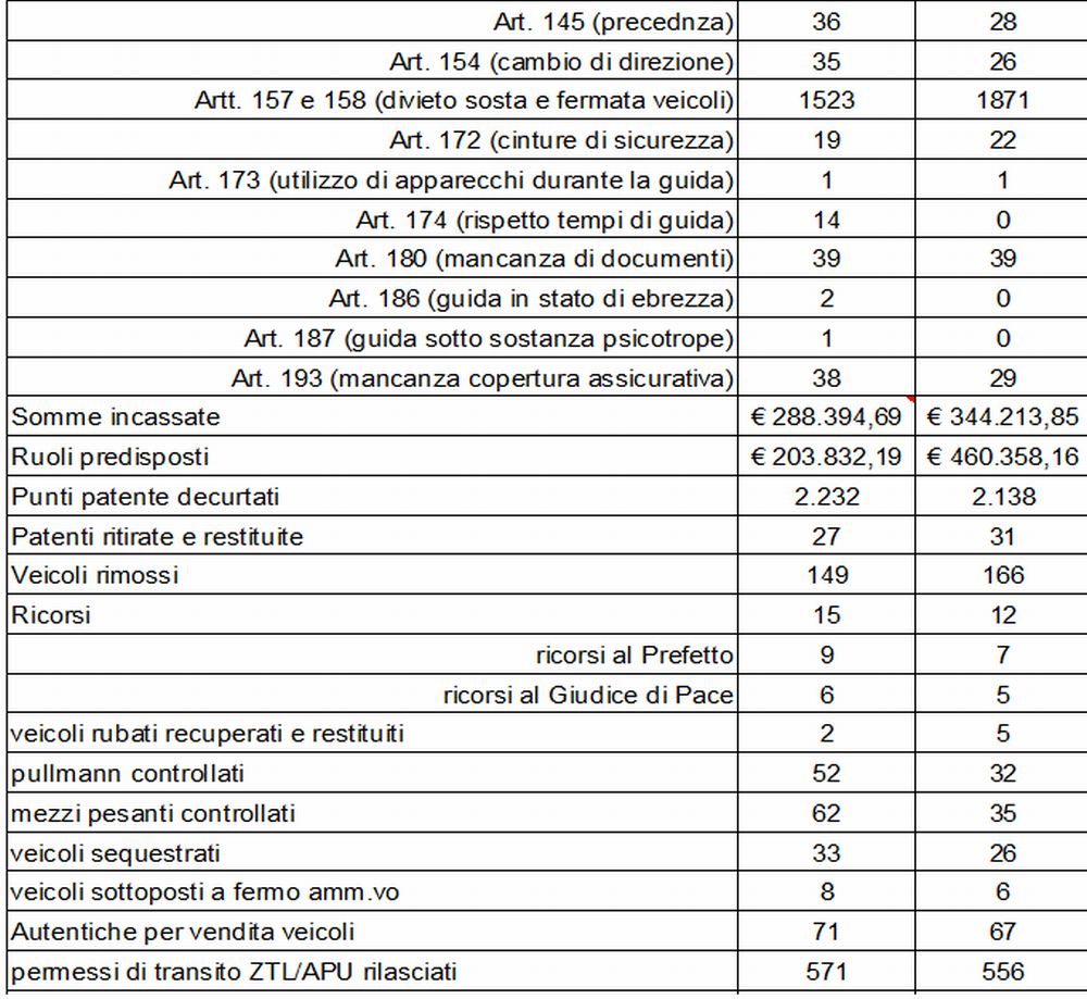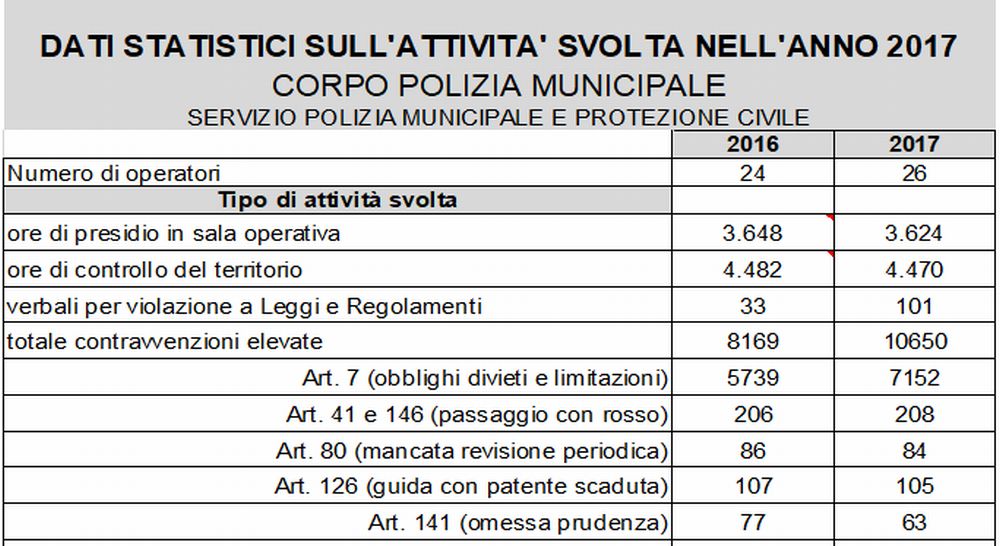 Il totale delle contravvenzioni elevate nel 2017 è pari a 10650, principalmente per violazioni di obblighi e divieti, sono state inoltre ritirate 31 patenti, decurtati 2138 punti sulle patenti, nonchè sequestrati 26 veicoli.