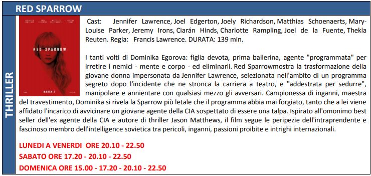 Ben 9 film in visione questa settimana alla multisala Megaplex Stardust di Tortona, fra cui l’ultimo di Jennifer Lawrence “Red Sparrow”.