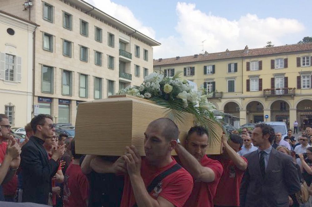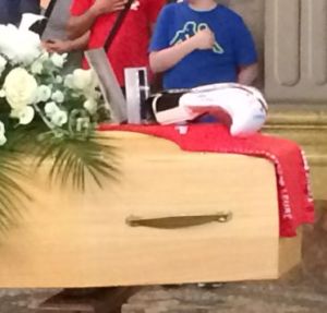 Le lacrime poi hanno lasciato spazio ai gesti: la bara alzata fuori dalla chiesa, davanti ad una corona di fiori a forma di guantone, i palloncini bianchi levati al cielo, la corsa al cimitero, con la maglietta rossa della società sportiva lasciata sulla bara insieme ad un’altra maglietta con le firme di tutti gli amici e una rosa bianca.