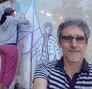 Le simbologie sono diverse: L’omino un po’ storto (stiamo prendendo bastonate da tutti i cantoni), che si aggrappa alla bandiera che se ben sospesa da terra riesce a sorreggerlo (gli ideali che rappresenta la bandiera, sono forti), poi quel rosso tendente al rosa di certe scritte (la discriminazione contro le donne), la pianta sullo sfondo sterile e senza foglie (la pianta è la vita e – di questi tempi – la vita è dura, non ci sono molte prospettive per i giovani e neanche tante sicurezze per gli anziani, in compenso ci sono tanti dubbi e all’orizzonte …), il cane che fa pipì (sul 2 giugno o sulla tag degli artisti …? – il cane che rappresenta l’amico fedele e … quel gesto irriverente, è la considerazione che gli amici dell’Italia hanno per l’Italia o gli amici degli artisti hanno per il lavoro degli artisti …?).