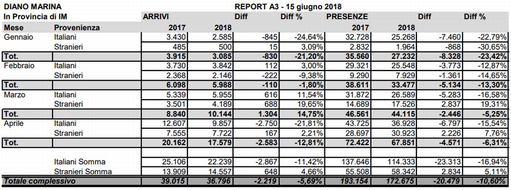 Secondo i dati dell’Osservatorio regionale del Turismo diffusi oggi, continua l’emorragia di turisti a Diano Marina, che da 15 mila presenze in meno nel primo trimestre ad aprile con i dati del primo quadrimestre sono salite salite a -20.479 con un ulteriore danno per l’economia locale, ma in compenso la percentuale è scesa da -13 a -10,6%.
