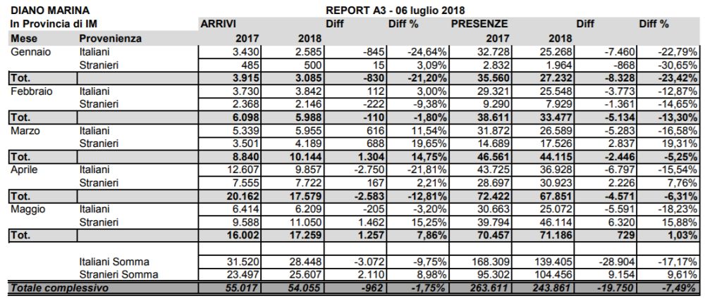 L’aspetto positivo, per Diano Marina è che finalmente, dopo quattro mesi di segni negativi, maggio ha segnato un’inversione di tendenza con un segno positivo dell’ 1,03% rispetto allo stesso mese dell’anno precedente.