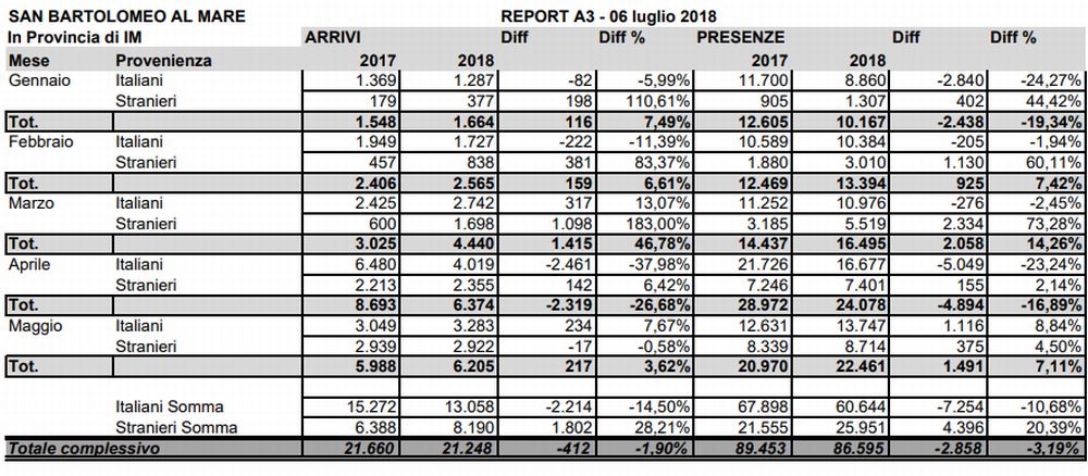 Notizie positive per San Bartolomeo al Mare: dopo il clamoroso calo di turisti avvenuto nel mese di aprile con -16,89% in fatto di presenze, a maggio la situazione è migliorata.