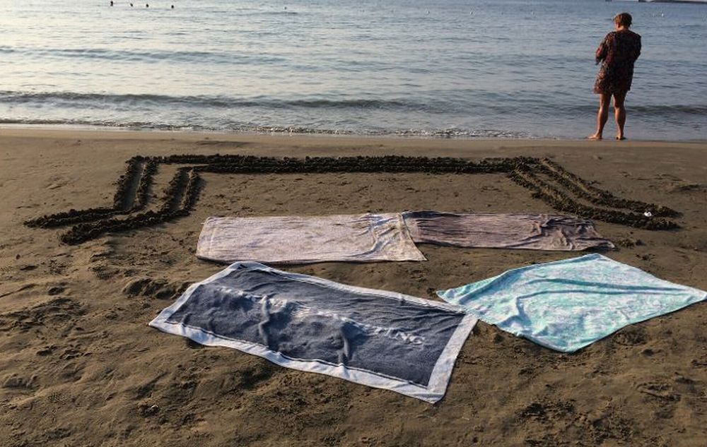 Purtroppo capita spesso: gente che si alza all’alba va in spiaggia lascia decine di teli e poi se ne va per ritornare più tardi: pazienza chi arriva appena inizia l’orario di apertura (le 8,30 del mattino) e poi ritorna magari dopo un un’ora o poco più, ma quello a cui abbiamo assistito oggi e documentato con questa immagine la dice lunga: per chi non la vede bene siamo in presenza di 4 asciugamani messi a rombo per occupare il maggior spazio possible davanti al mare in primissima fila, poi visto che lo spazio era evidentemente poco, i giovani (perché di giovani si tratta) hanno “segnato” il territorio come fanno i cani, tracciando una doppia striscia per impedire che altri potessero occupare il territorio.