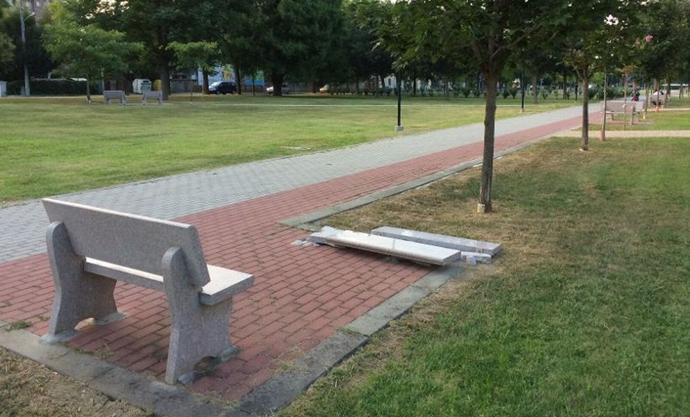 Nell’ultima parte del parco, per chi viene dal centro si trova una serie di panchine molto belle, in marmo rosa, ma qualcuno ha pensato bene di sfasciarne una.