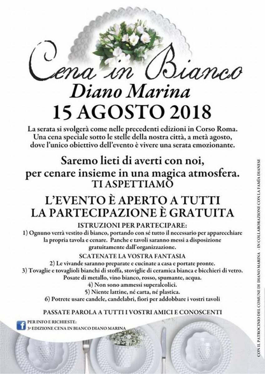Alle 21 inizierà la cena. Per maggiori informazioni cercare sul gruppo Facebook “3^ edizione cena in bianco diano marina”.