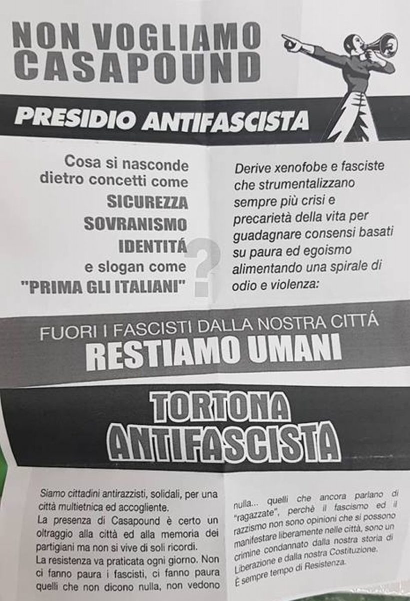Il Comitato Antifascista di Tortona, già da sabato scorso ha distribuito un volantino molto duro dal titolo “Non vogliamo Casapound” che potete leggere integralmente a fine articolo. Il Comitato prepara, a quanto pare, una manifestazione antifascista che si terrà proprio il giorno dell’inaugurazione di Casapund: un “Presidio antifascista” a poche decine di metri da via Puricelli.